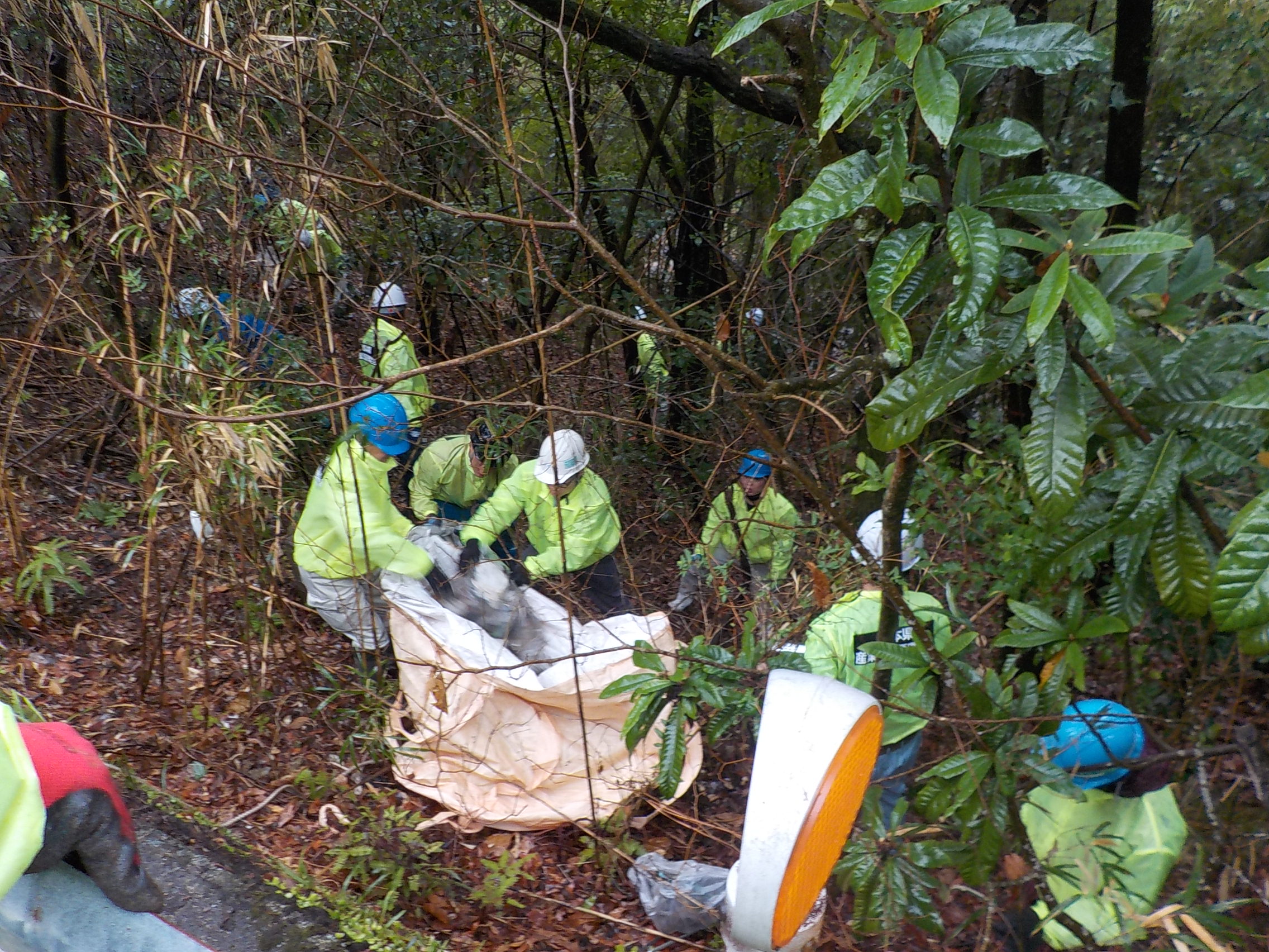 作業は、道路沿いのがけ下に投棄されたごみを各自、人力で拾い集めました。